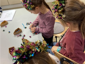 The children use various materials, textures, and colors to create their own Christmas crown that reflects their personal taste.