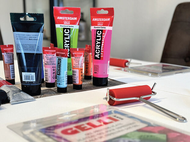 Discover the monograph style with the simple gel printing technique. After a brief introduction to the technique, colour theory and composition, you can start experimenting and getting creative. The gel plate is a soft, flexible plate made from gelatine, which is used with acrylic paint.